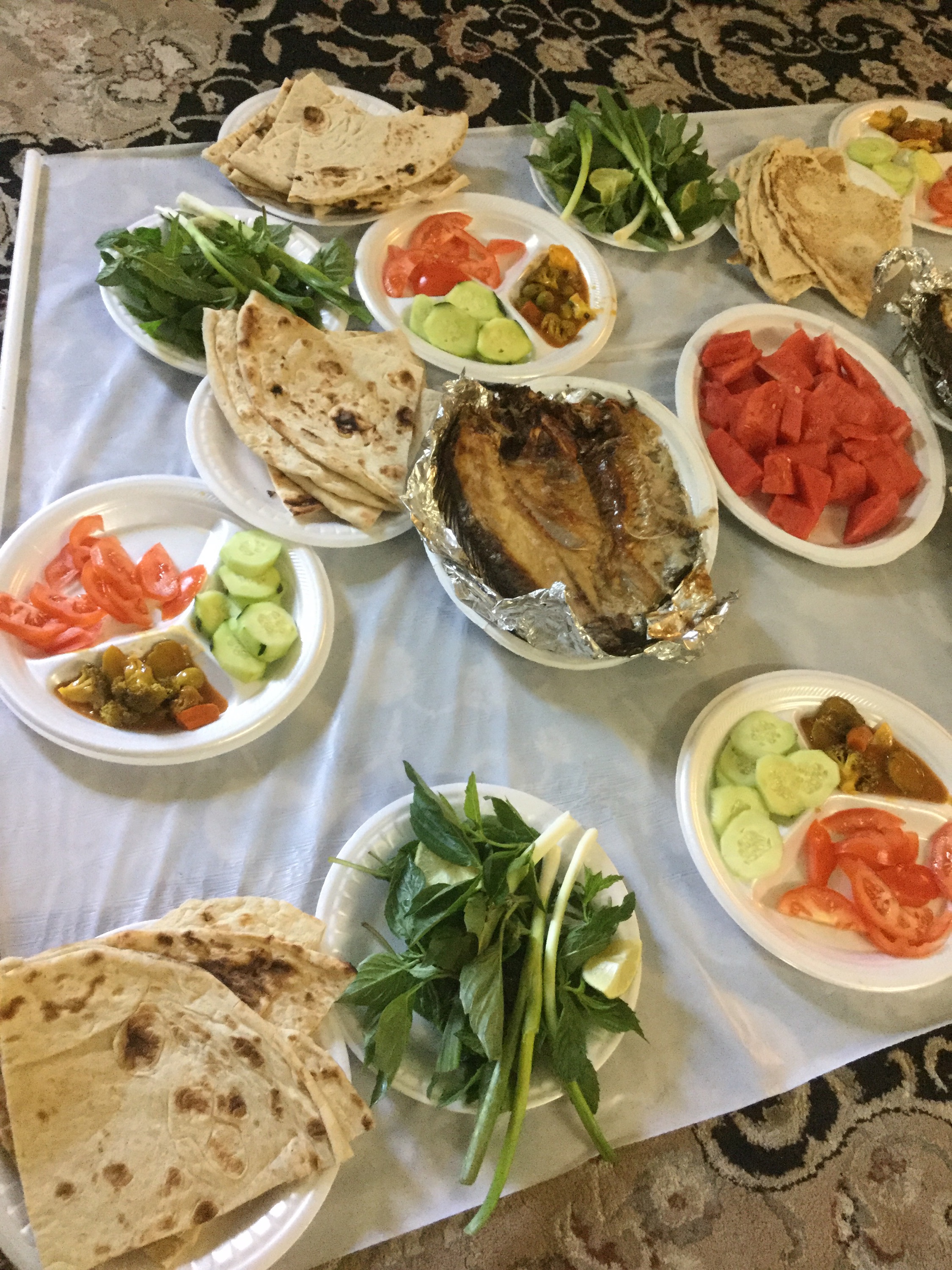 Yesterday I visited a family from Iran for a meal commemorating 45 days after the husband’s father died. We sat and ate on the floor. Our meal was fish and veggies.