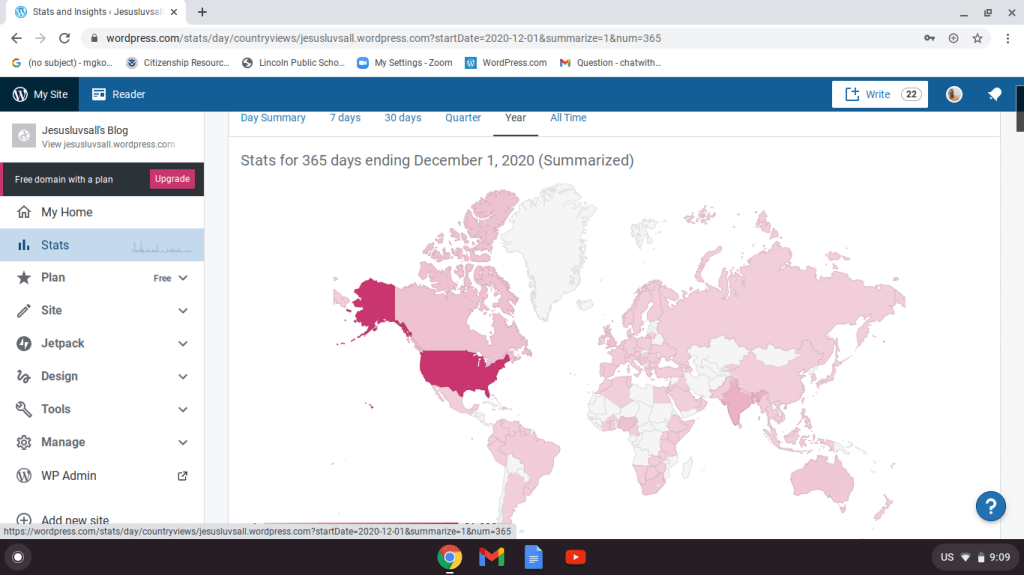 I was curious about my blog for the past 12 months and took a screen shot of the map in my WordPress of views from various countries. Hopefully the people from the various countries benefited from my blog. Even more so, that they read about Jesus and his love.