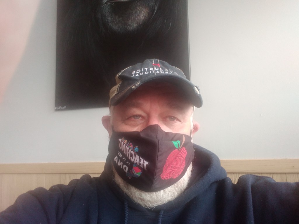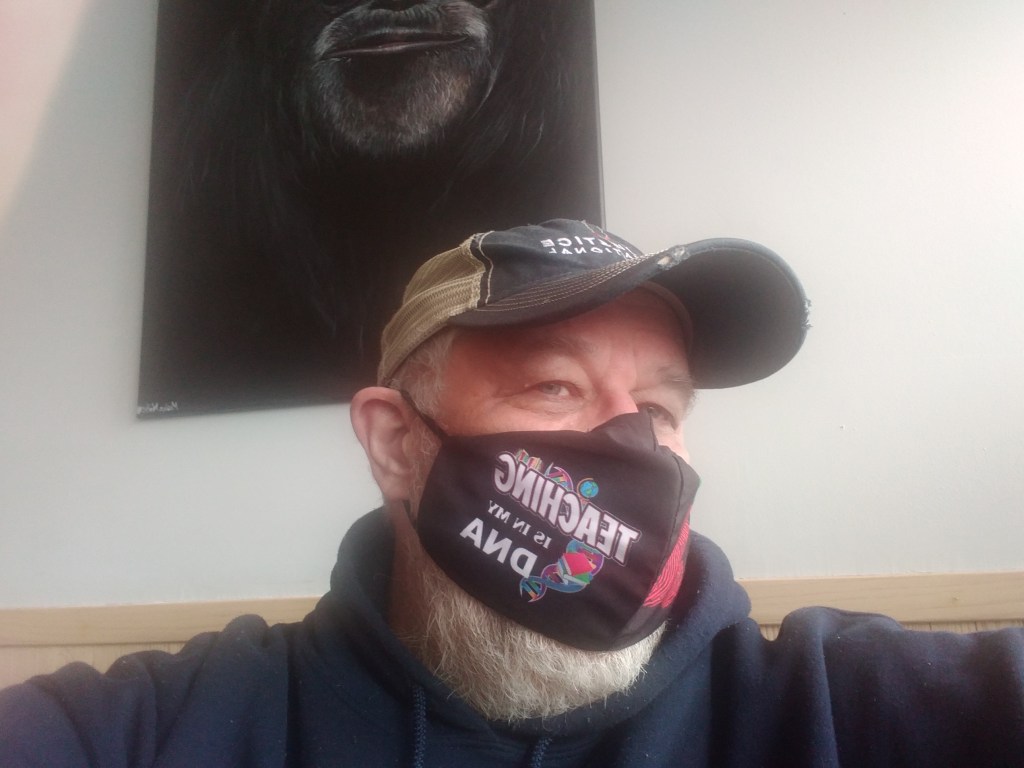 The tables are spaced 6 feet apart and not many people here. Yes I am wearing a mask. This is my favorite mask to wear. I think you can see why in the picture below.