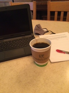 Slowly things are improving and I am venturing out a little after a year of being isolated most of the week. Yesterday I went to one of my favorite coffee shops and I brought something with me.