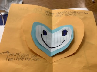 My student went to PACT Time in her daughter’s 2nd grade class. She came back to my classroom because her precious daughter wanted to give me a Thanksgiving card she had made, I think with the help of her mom.