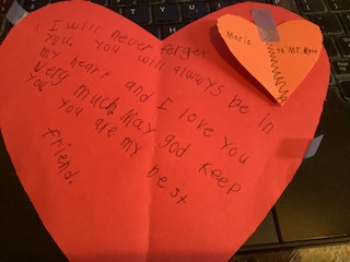 I went into her classroom to give the children cookies, When I went in, she hugged me and cried. I held her for a few minutes while she cried, and reminded her again that Jesus is always with her. After I left, her teacher helped the students in her class to make cards for me. The little girl, Maria, made this one for me.