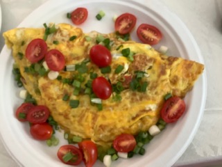 One is depicted by the picture. A woman was teaching cooking for Middle School age kids in their church. After my class, I went upstairs and followed the pleasing aroma of food being cooked to the kitchen. She blessed me with not one, but two omelets. I won’t need to eat the rest of the day. When I say omelet, I mean ultimate omelet. It had diced peppers, mushrooms, onions, tomatoes, diced potatoes, and cheese.