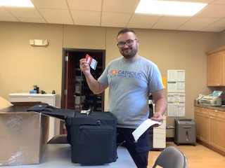 Nicolai has been working at Catholic Social Services in the warehouse where they receive and distribute donated items. He is also taking English classes, taking care of his wife and three year old daughter, and helping with worship at the Ukrainian Church here.